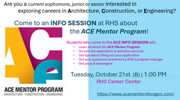 An ACE Mentor Program INFO SESSION (in-person) is scheduled at Reynolds HS on Tuesday, October 21st in the Career Center. Contact Shannon Selby, College & Career Coordinator, if you want to sign up.